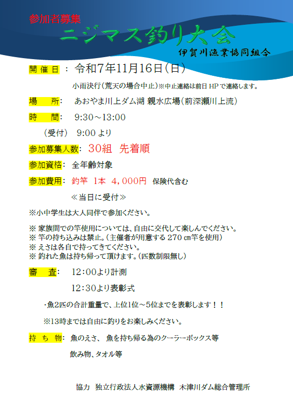あおやま川上ダム湖 親水広場にて、ニジマス釣り大会を開催致します!